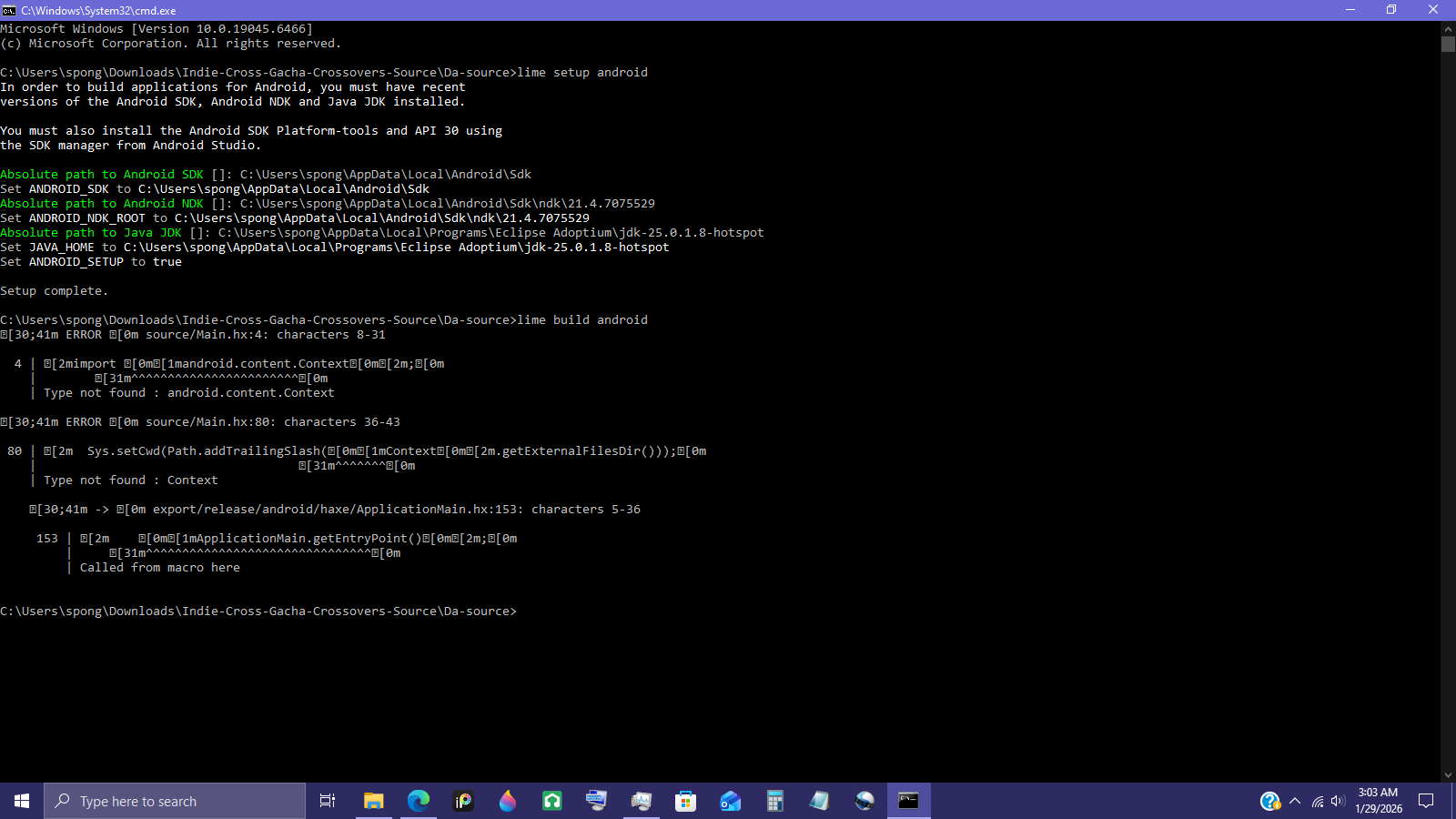 To sum up my situation right now… I’m trying to port my FNF mod to mobile so people on android devices can play it. So I followed Lime’s guide on how to compile haxe games for android, and I got the setup part done within a snap cause you know… the download links are just… there, but…