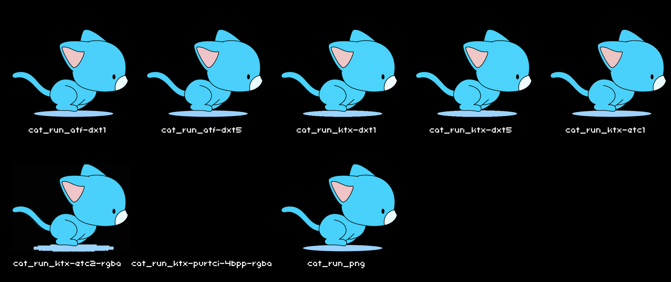 In my testing, both Neko, and HTML5 appear to support ATF with DXT. The first two cats are spritesheets in ATF (DXT) format. The last one on the bottom is a regular PNG spritesheet.