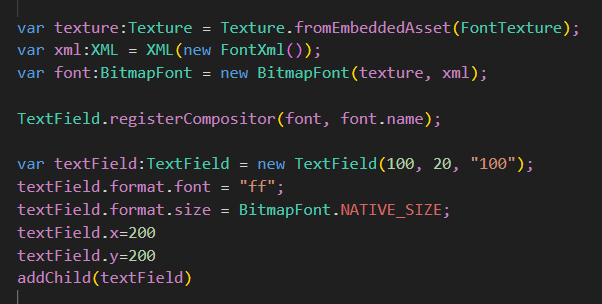 var format = new TextFormat(BitmapFont.MINI, BitmapFont.NATIVE_SIZE, 0x000000);
