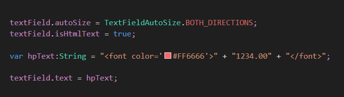 var hpText:String = "<font color='#FF6666'>" + "1234.00" + "</font>";