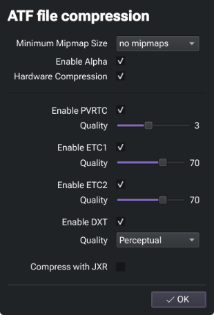 For desktop and mobile support from a single ATF, Iâd suggest packaging at leastDXT and ETC2.