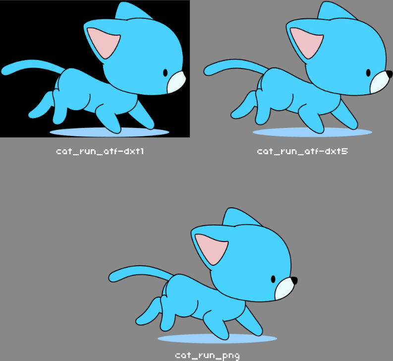 Note the cat_run_png image on the bottom there. That represents the lossless quality version. With respect to the ATF format, the cat_run_atf-dxt5 version in the top-right is the desktop GPU texture compression format for comparison.