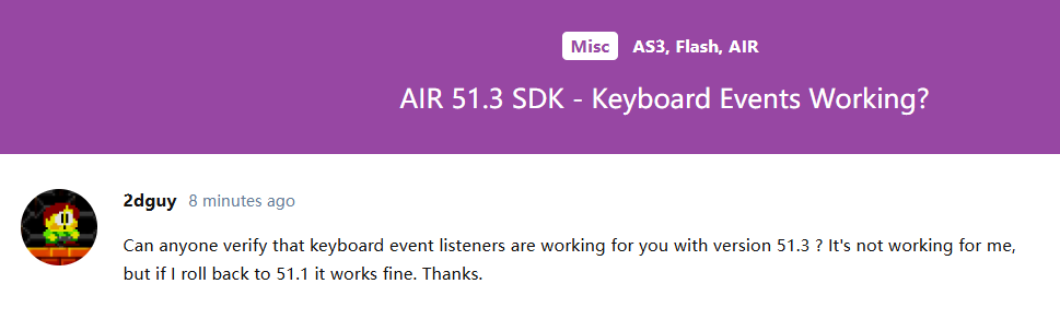 Can anyone verify that keyboard event listeners are working for you with version 51.3 ? It’s not working for me, but if I roll back to 51.1 it works fine. Thanks.